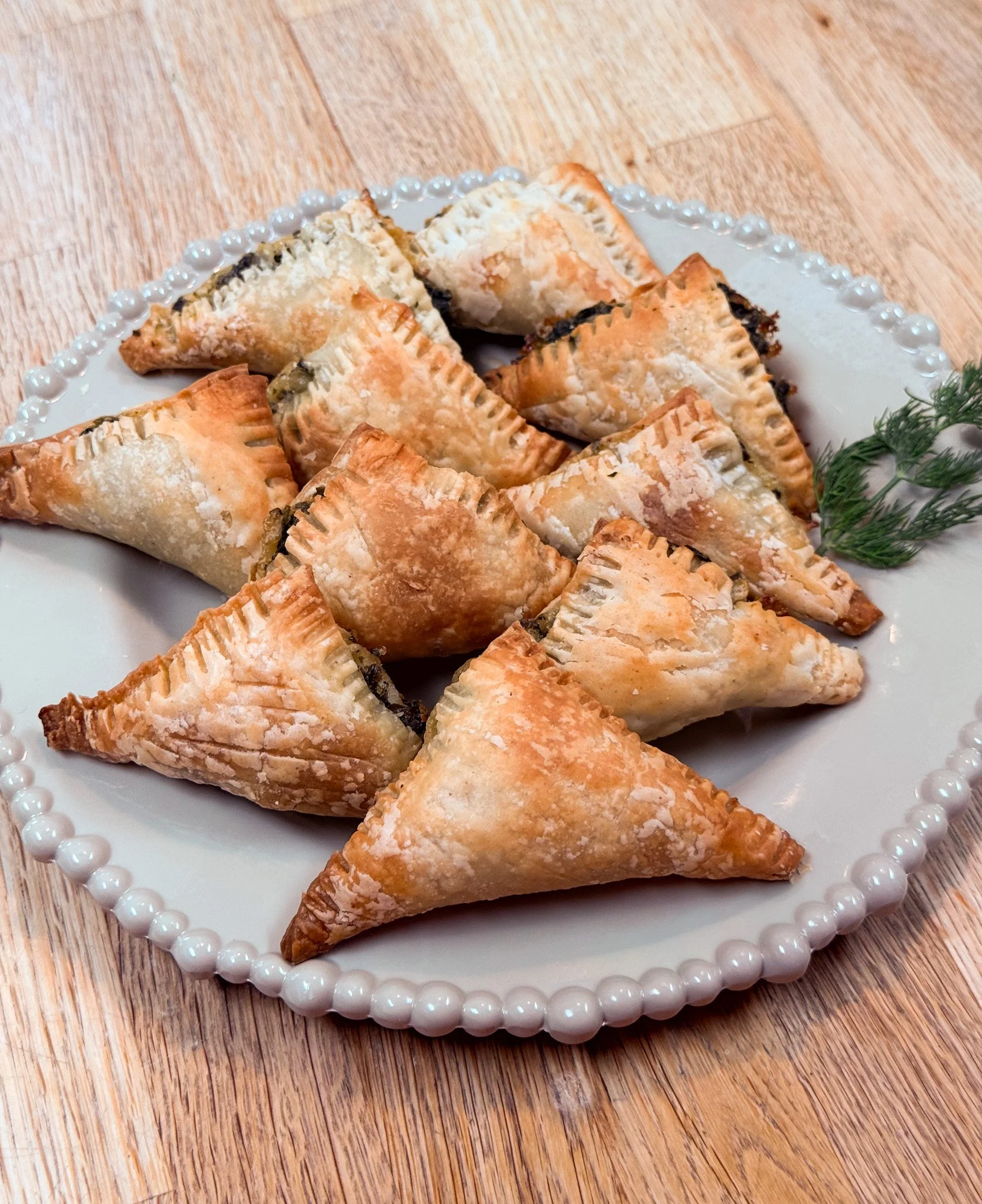 If you’ve been with me for a while, you know this is not my first variation of this classic Greek meze, or appetizer. Years ago I developed Spanako-patties, which were a variation without the classic pastry casing, rather, the spinach filling fried as a “patty”. They are delish and feature the filling, which is the best part in my opinion. Yet, I was still missing the crunch of that pastry. So one day as I was perusing my grocery store (actually found at Publix!) I discovered this gluten and dairy free puff pastry from Loren’s. The results are spectacular, if I do say so myself, and my family agrees. And they can be skeptics. I hope you try this and let me know how it works for you!